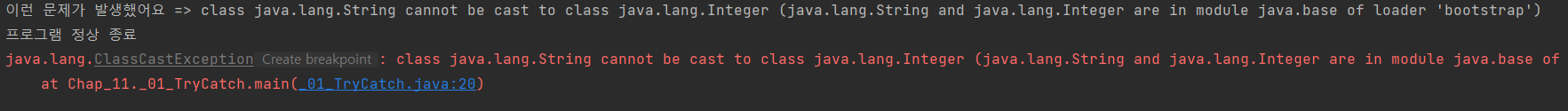 System.out.println("μ΄λ° λ¬Έμ κ° λ°μνμ΄μ => " + e.getMessage());