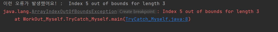 System.out.println("μ΄λ° μ€λ₯κ° λ°μνμ΄μ! : " + e.getMessage() );