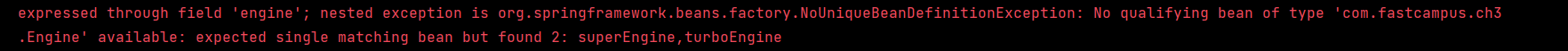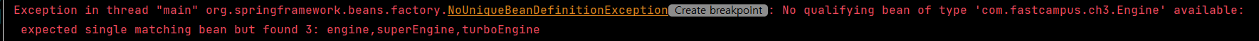Engine.class๋ type๊ณผ ์ผ์นํ๋ ๊ฐ์ฒด๊ฐ 3๊ฐ๋ ์์ด์ ๋ฌด์์ ๊ฐ์ฒด ์ ์ธ๋ถ์ ์ฐ๊ฒฐํด์ค์ผ ํ ์ง ๋ชจ๋ฅด๊ฒ ๋ค๋ ๊ฒ์ด๋ค.