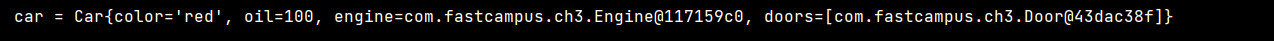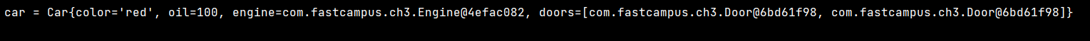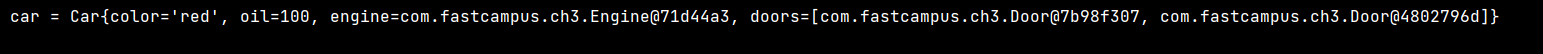 ์ฐ๋ฆฌ๊ฐ toString ๋งค์๋๋ฅผ ์ฌ์ ์ํด์ฃผ์ง ์์ ์ฑ Car ๊ฐ์ฒด๋ฅผ ์ถ๋ ฅํ๋ฉด ๋ฐ๊ณผ ๊ฐ์ด ์ถ๋ ฅ๋๋ค.