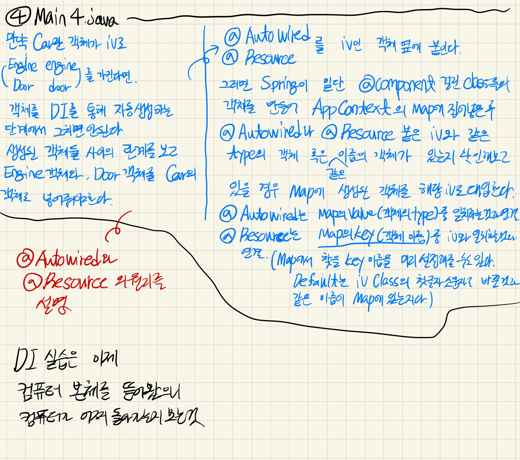 Class์ iv์ ๋ง๋ ๊ฐ์ฒด๋ฅผ ์ฐ๊ฒฐ์์ผ ์ฃผ๋ @AutoWired ์ด๊ณ , ๋ค๋ฅธ ํ๋๋ Map์์ Name (๊ฐ์ฒด ์ด๋ฆ)์ผ๋ก ์ฐพ๋ @Resource๊ฐ ์๋ค.