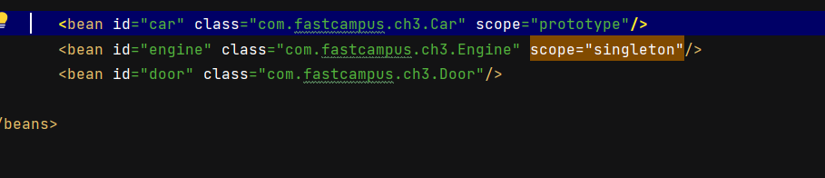 ๋ฐ์ scope="singleton" ์ด๋ ์์ฑ๋ ๊ฑธ์ด๋จ๋๋ฐ ์ด๋ bean์ default ๊ฐ์ด์ด์ ๊ตณ์ด ๋ฐ๋ก ์ ์ธ ์ํด๋ ๋๋ค.