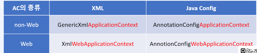 AC์ ์ข ๋ฅ๋ Beans ์ ์๊ฐ ๋ค์ด์๋ ํ์ผ์ด XML ์ค์ ํ์ผ์ด๋ ์๋๋ฉด ์๋ฐ์ฝ๋๋ก ์ ์ธ JavaConfig์ด๋์ ๋ฐ๋ผ์ ์ผ๋จ ๋๋๋ค. ๊ทธ๋ฆฌ๊ณ Web ๋ง๋ค๊ธฐ ์ฉ์ด๋ ์๋๋์ ๋ฐ๋ผ ํ๋ฒ ๋ ๋๋๋ค.