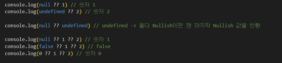 // (null , undifined ํฉ์ณ์ nullish๋ผ๊ณ ํ๋ค.)