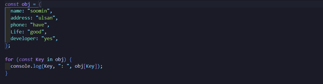 Key๋ผ๋ for ๋ฃจํ ์์์๋ง ์ฐ์ด๋ ๋ณ์๋ฅผ ๋ง๋ค์ด์ ์ฌ์ฉํ๋ค. Key๋ผ๋ ๋ณ์์๋ obj์ key๊ฐ์ด ์ฐจ๋ก๋๋ก ๋ค์ด๊ฐ๋ค. ๊ทธ๋์ key๋ง ํ๋ฆฐํธํ๋ฉด key ๊ฐ์ด ๋์จ๋ค. : ์ค๋ฅธ์ชฝ์ ๊ฐ์ ๋ณ์๋ฅผ ์ด์ฉํด obj์ Value๋ค์ ๊ตฌํ๋ ๋ฐฉ๋ฒ์ ํํํ๋ค.