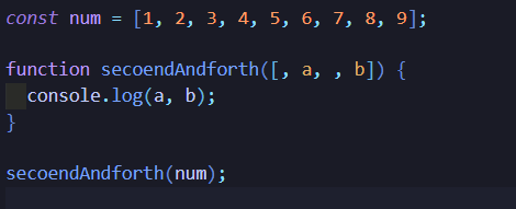 ๋ฐฐ์ด ๋ํ ๋งค๊ฐ ๋ณ์ ๋ถ๋ถ์์ ๋ฐ๋ก ๊ตฌ์กฐ๋ถํด๊ฐ ๊ฐ๋ฅํ๋ค. ์๋ค์ํผ ๋ฐฐ์ด ๊ตฌ์กฐ๋ถํด๋ ๊ฐ์ฒด๋ ๋ค๋ฅด๊ฒ ๋ณ์๊ฐ ์ฐ์ธ index๋ก์ ์์๋ฅผ ๊ตฌ๋ถํ๋ค. (๊ฐ์ฒด๋ ๋ณ์์ ์ด๋ฆ์ด key ์ด๋ฆ์ด๋ ๋์ผํด์ผ ํ๋ค. ๋ฐ๋ผ์ ํด๋น ๋ณ์ ์ด๋ฆ์ผ๋ก ๋์ํ๋ value ๊ฐ์ ์ฐพ์ ๋ฝ์๋ธ๋ค.)