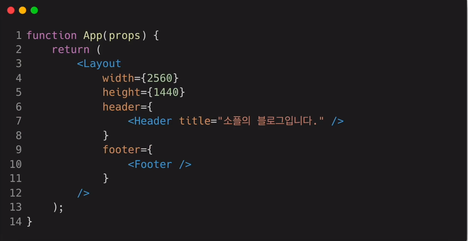 ์์ ์์์์ Header์ footer๋ฅผ ๋ณด๋ฉด, ์ปดํฌ๋ํธ๋ฅผ props์ ๊ฐ์ผ๋ก ๋ฃ์์์ ์ ์ ์๋ค. ๋ค์ 2,3๋ฒ ๊ณผ์ ์ ๊ฐ๋ค. ํด๋น ์ปดํฌ๋ํธ๋ฅผ ๊บผ๋ด์ ๋ณธ ์ปดํฌ๋ํธ์์ ์ฐ๊ณ ์ถ๋ค๋ฉด, props.header ๋ props.footer๋ผ๊ณ ๋ถ๋ฌ์ ์ฐ๋ฉด ๋๋ค.