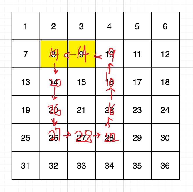 14 -> 8์ ์๋ฆฌ๋ก, 8์ด 9์ ์๋ฆฌ๋ก ์๊ณ ๋ฐฉํฅ์ผ๋ก ์์ง์ด๊ณ ์์์ ๋ณผ ์ ์๋ค.