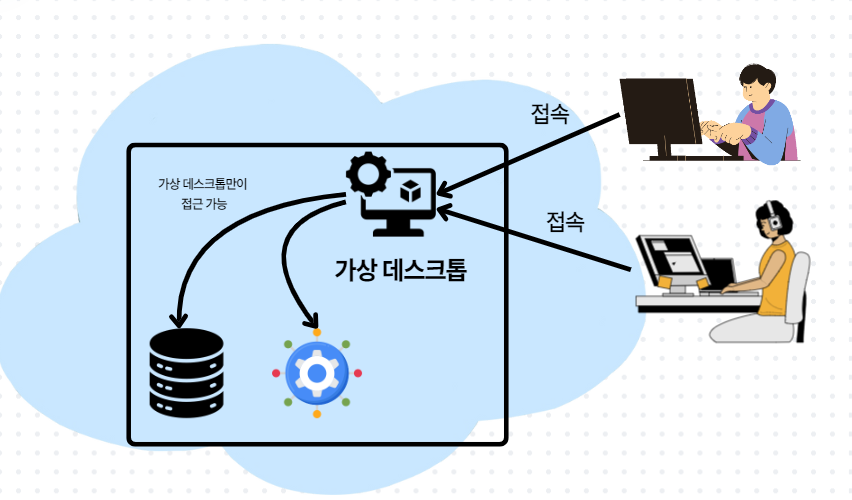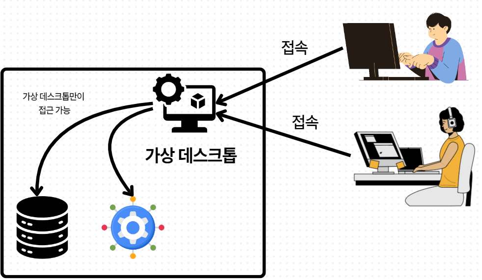 νμ¬μ μλ²μ κ°μ λ°μ€ν¬ν±(μ»΄ν¨ν°)λ₯Ό ꡬμΆν΄λκ³ , λͺ¨λ μ§μλ€μ ν΄λΉ κ°μ λ°μ€ν¬ν±μ μ μνμ¬ μ