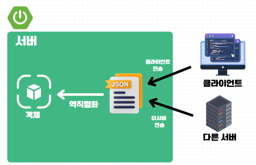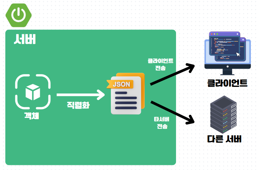 ex)List<String> hobbies = Arrays.asList("Reading", "Traveling")โ"hobbies": ["Reading", "Traveling"]- ์ด๋ฌํ ๊ณผ์ ์ ๊ฑฐ์ณ ์ง๋ ฌํ๊ฐ ๋๋ค.