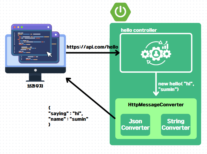 ์ ์ฐ๋ฉด ๊ธฐ์กด MVC ํจํด์ Sever Side Rendering์ด ์๋๋ผ Client Side Rendering์ ํ๊ณ ์๋ฒ๋ API ์๋ฒ๊ฐ ๋๊ฒ ๋ค๋ ๊ฒ์ ์ ์ธํ๋ ๊ฒ๊ณผ ๊ฐ์ ๋ง์์ผ๋ก, ๊ธฐ์กด์ ์ฌ์ฉํ๋ ViewResolver ๋์ HttpMessageConverter๋ฅผ ์ด๋ค. ํด๋น ์ธํฐํ์ด์ค๋ Http๋ฅผ ํตํด ๋ฉ์ธ์ง๋ฅผ ์ฃผ๊ณ ๋ฐ์ ์ ์๋๋ก ๊ฐ์ฒด๋ฅผ ์ํฉ์ ๋ง๊ฒ ๋ณํํ๋ ๊ท์น์ ๋ด์ ์ธํฐํ์ด์ค์ด๋ค.