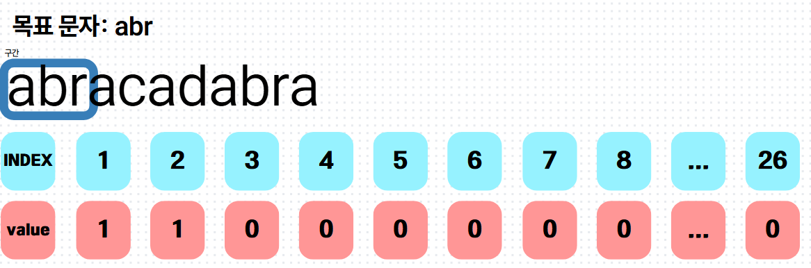 - 26๊ฐ์ ์ํ๋ฒณ์ ๋ํ ๋ฐฐ์ด์ ๋ง๋ ๋ค. (index = ๋ฌด์จ ์ํ๋ฒณ์ธ์ง ๊ฐ๋ฅดํด, value = ๊ตฌ๊ฐ ๋ด์ ํด๋น ๋ฌธ์๊ฐ ๋์จ ํ์)