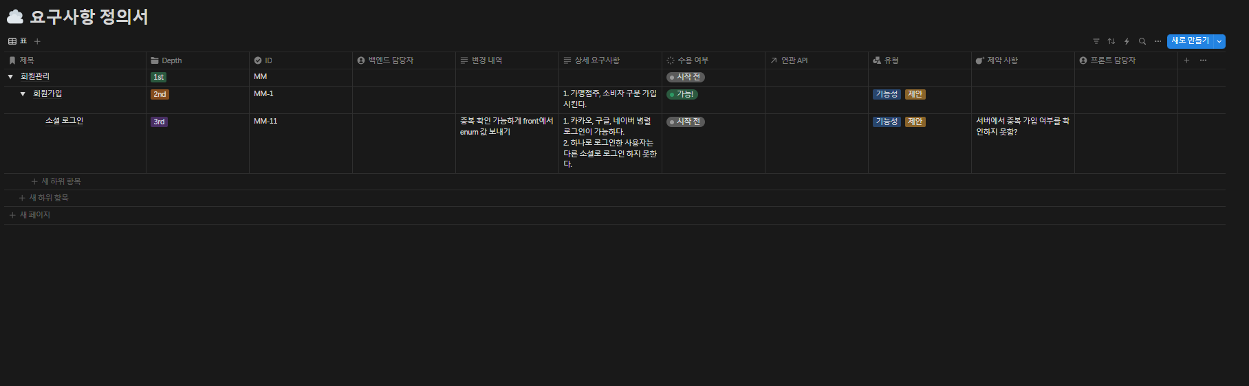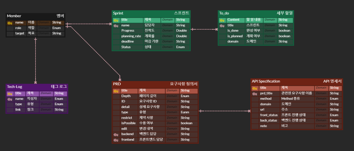 - 1๏ธโฃ ์๊ตฌ์ฌํญ์ด ๋ถ๋ชจ ํ ์ด๋ธ, API ๋ช ์ธ์๊ฐ ์์ ํ ์ด๋ธ์ด ๋์ด ์๋ก ์ฐ๊ด๊ด๊ณ๋ก ๋ฌถ๋๋ค. ๋ํ ์๊ตฌ์ฌํญ์ด ์์์ด ๋์ด ๋ฉค๋ฒ ํ ์ด๋ธ๊ณผ ์ฐ๊ด์ง์ด, ๋ฉค๋ฒ ๋ณ๋ก ์์ ์ ์๊ตฌ์ฌํญ๊ณผ ๊ตฌํํด์ผํ API ๋ชฉ๋ก์ ๋ณผ ์ ์๊ฒ ๋ง๋ค์๋ค.
