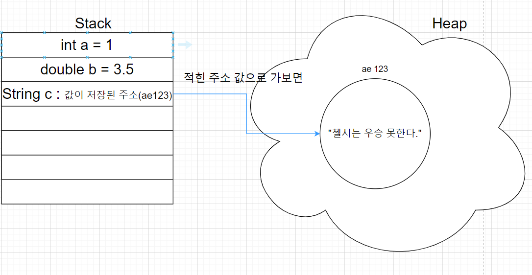 ๋ฐ๋ฉด, ์ฐธ์กฐํ์ ์ ํด๋น ๋ณ์์ "๊ฐ์ด ์ ์ฅ๋์ด ์๋ ์ฃผ์"๊ฐ ์ ์ฅ๋์ด์๋ค. ๋ฐ๋ผ์ ํด๋น ๋ณ์์ ์ ์ฅ๋ ์ฃผ์๋ก ๊ฐ์ ๊ฐ์ ํ์ธํ๋ค. ๋ง์ฝ String c = "์ฒผ์๋ ์ฐ์น ๋ชปํ๋ค." ์ด๊ณ , ํด๋น ๋ฌธ์์ด์ด ํ์ ์ ์ฅ๋ ์ฃผ์๊ฐ 'ae123' ์ด๋ผ๋ฉด, ํ์ ae123์ผ๋ก ๊ฐ์ ๊ฐ์ ํ์ธํ๋ค.
